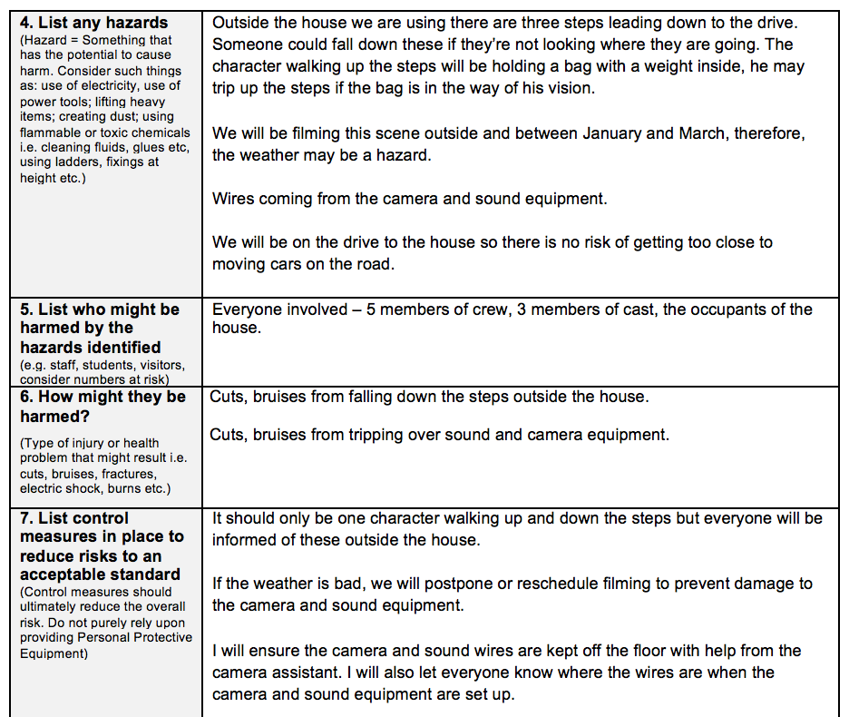 I have organised crew members ready for the production stage. They are all experienced within their job roles. This was a requirement for my creative side to the production. I couldn't get just anyone as they wouldn't add any value to the production. As a result of this, I sent out an email to the first and second years on the TVP course with the hopes of finding someone interested and experienced in sound and camera. By doing this I managed to source our sound assistant. She has experienced being on sound before and she has a general interest in the role as well. However, due to not many people responding to the email, I had to contact a couple of people directly. This is how we found out camera assistant. She had a little amount of experience on the camera but she was passionate about it and is very interested in the role which is what we wanted. As a result of having both the sound and camera assistants interested in the role, means that I can rely on them and expect them to stay on board throughout the production stage of the project. Our last crew member I felt needed to be a make-up artist. This was because we will be using a lot of fake blood and we'll need a couple of black eyes, and I felt that we needed someone experienced in theatre make-up to help us out. This thought also came from our previous project when we struggled to make the blood splatter onto the actors face. After contacting someone I know, I was introduced to someone else who was experienced in fake blood and prosthetics. By talking to her, she was able to give me tips on how to create the blood splatter and what tools I would need to do this. As she was free on our filming dates, we were more than happy to have her on board. By having someone experienced with make-up, it should be able to bring the authenticity of the film together by having realistic blood splatters and black eyes.